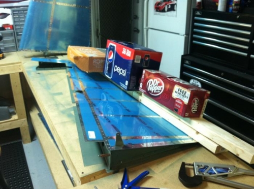 After applying the proseal I cleacoed every hole then weighed down the leading edge so it can set up as per the plans. I will final rivet in a day or two once it sets up.