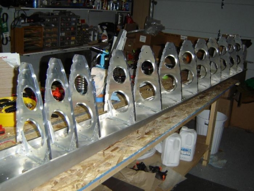 I couldn't resist breaking out the left wing spar and attaching the forward ribs. I'm going to have to do some cleaning and organizing in the garage to get things ready to work on the wings and laying the ribs out on the spar helps get a visual on what to expect and how to organize.