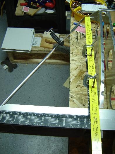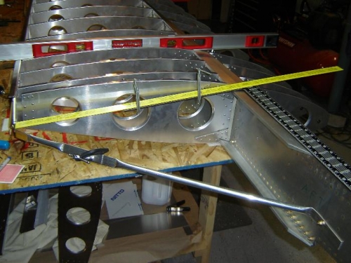 I also added an extension to my caprenters square so that I could reach the rear spar and square the hole and set the distance accurately. I also did this with the wing flat on the table. It just proved to be easier to do it this way and with two levels across the spars it was very accurate.