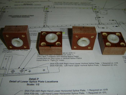 Finished the night by completing the fabrication of the rudder cable fairlead blocks. I used a Forstener bit in my drill press to drill the large center hole and a countersink bit for the mounting holes. Lots of builders complain about the smell and mess involved in this step. As a former woodworker it didn't seem to be a big deal. No different that drilling large holes in wood and making a lot of sawdust. The bit would get hot, but reducing the speed and taking your time it was no problem.
