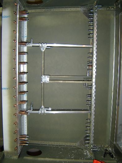 Installed all of the channels and gussets for the floor. This was a little bit tricky since there is no way to clamp the parts to the floor to keep everything aligned. Zach was home from school so he assisted in keeping all those blue lines running through the holes.