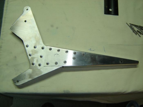 Deburred, cleaned and riveted rudder horn assembly. The drive horn itself required lots of scratch removal on the 3M wheel, the result of all of the failed bending attempts. There's nothing better than a 3M Scothbrite wheel on a grinder.