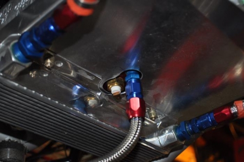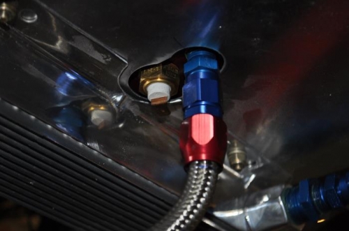 To fit I had to remove the oil cooler and cut the baffle as well as the leading edge of the cooler to clearance the hole for the temp sender. After checking the fit a few times I finally got it where it needed to be. A bit unnerving cutting into the flange of the cooler, but there is lots of space there to do it.