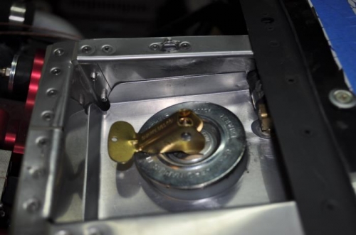 More lessons learned from other builders. The design of the fuel filler allows spilled fuel during refueling to simply fall into the cockpit. For me and many other builders that's unacceptable. The fix is a simple piece of sheet metal cut and bent to fit over the filler neck and around the vent fitting. I fabricated this one fairly quickly although it takes some trimming to get it to fit just right. It will need to be sealed with RTV or ProSeal to keep it from leaking but it will prevent minor spills from falling straight into the cockpit.