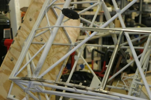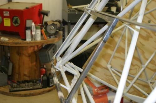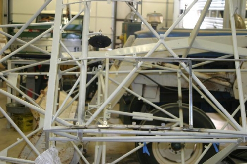 I want to install skylights in order to improve situational awareness in the turn; I'd ordered a skylight kit from Jim Clevenger, but after looking through it I decided not to install it. It is designed to fit between the fabric and formers on an already covered and finished airframe; the outer frame rests on top of the fabric and the acrylic and inner frame lies on the inside of the fabric. My concern was that this would put a lot of stress on the fabric. Accordingly, I decided to hard mount the skylight on tabs from the wing former outboard and onto the previously installed tabs from the overhead panel. The aft portion needs attachment to the standoffs, and I fabricated 90 deg right angle brackets of .020 4130 to bridge the wing former to the to the standoffs, and welded 5 tabs to each former. I'll next contour .032 2024-T3 to fit onto the tabs and brackets, with overlap onto the overhead panel, make a skylight cut-out and an inner frame. To be followed of course by priming!