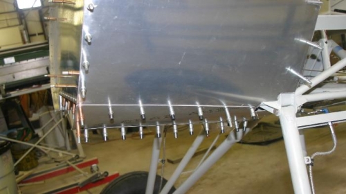 More boot cowl; a panel to join the firewall to the cabin tubing, a panel to close off aft of the tubes, and a large panel to allow avionics access as well as two bottom access panels to join with the stainless exhaust tunnel. I'd originally wanted to do a fiberglass panel for the avionics access, but it wouldn't follow compound curves as well as aluminum, so I went with aluminum. The bottom access panels fit best after using a roller to curve them.