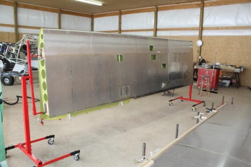 The fuselage is more or less ready to fit the wings, so it's finally time to get the wings out their packing crates. I assembled the Bogert wing rotators, and mounted the right wing. I fabricated poplar 1 x 2 strips to protect the skin edges; I attached them with 6/32 screws and #10 washers when I could go through existing rivet holes, clamps when I couldn't and glued some connecting pieces. There was a lot of styrofoam to clean up, too.