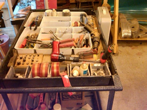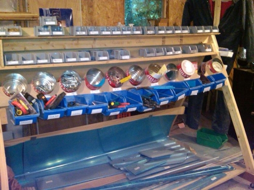 Bought the rolling tool tray from Harbor Freight for $29. The rolling parts stand is a modification of what I saw on the PBS video "From the Ground Up." It has sheet parts on the bottom, bins for tools, clecos in coffee cans, and rivets on top. The back side is a corkboard. The whole thing is on wheels.