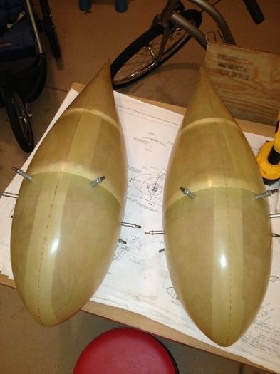 Began wheel pants instal. Began by prepping the forward (VA-157A) and aft (VA-157B) fairing halves by fitting together then trimming to improve fit. After many fit/sand/fit iterations, the fairings mate together pretty well. Next, the 7 holes were drilled for the fwd-to-aft attach screws. A centerline was then marked along each fairing, although this was quite difficult and arbitrary at best. I did this by eyeball as the only real measurement I could determine was based on the wheel opening and who knows how accurate that is.