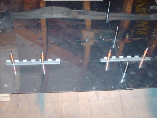 i fit and drilled the rear seat hinges. i had previously made these hinges but felt that they did not sit on a true and square line and that that would cause the rear seat to sit at an angle. i made new hinges and located them using the 4-7/8" ref dimension from the floor/bulkhead interface as shown in the drawings. the result is a much straighter pin (hinge) line.