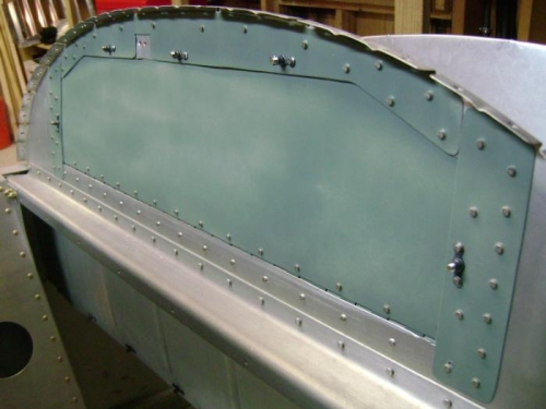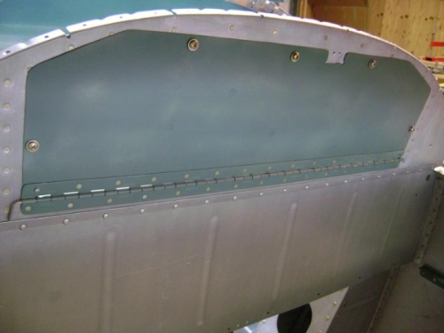 completed the instrument access panel. cleaned, scuffed, cleaned again, and primed the reinforcing plates, the hinge, and the door. riveted same, installed nutplates and screwed the door shut.