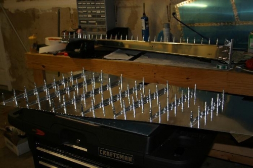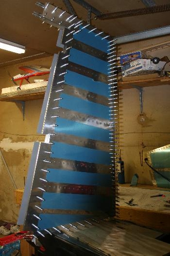 Trimed stiffners for right skin. primied stiffners and skin. Backriveted stiffners to skin and clecoed right skin to skeleton.