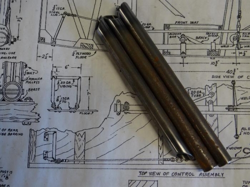 I cut the parts for the front rudder pedals some time ago, but have been saving them for a day where I didn’t have much else planned… today is the day I used an example that I saw on the EAA’s Hints for Homebuilders series and made a simple jig out of a piece of scrap plywood and finishing nails. This worked well to hold the parts in place while I tacked them. I finished welding in the vise and used my flattening press to flatten the ends where they will mount to the floor fittings.