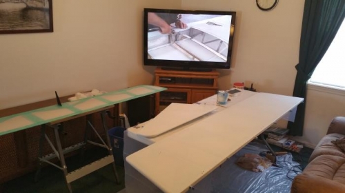 With all of the fabric work done, it was time to lay on the primer coat. I started with the vertical and horizontal stabilizers, applied 2 coats with a foam brush, wet sanded with 1000 grit sandpaper wrapped over a sponge, then applied 2 more coats, which provide good coverage with a nice smooth texture. The sanding knocked down some of the sharps (peaks) created around the pinked tape edges, and also smoothed down the initial brush strokes. 818, stock photo of Sherwin Williams primer