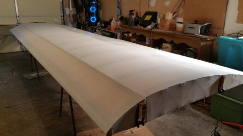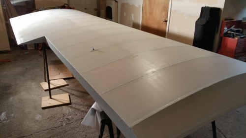 Applied primer to wing using the same method as the control surfaces. Two coats applied with a 3” foam brush, wet sanded with 100 grit sandpaper, then two finish coats.