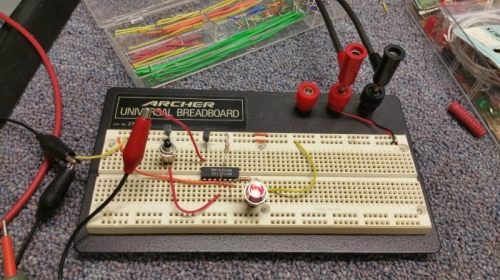 I built a simple circuit that will act as a charge indicator. Using a NAND gate for logic and sensing the 12V Charging signal line from the voltage regulator (divided down to 5V for TTL), this circuit will illuminate a red LED when no voltage is present on the regulator Charging signal line, but will turn the LED off once the dynamo is charging. Rather than simply rely on the volt meter for electrical system status, this LED indicator will let me know immediately if the charging system fails.