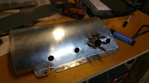 Drilled holes for plug wires and fabricated nipple for crossover cooling tube.
