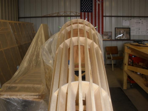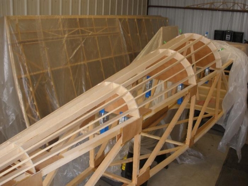 Trial fitted mid-supports and stringers. On the recommendations of others, I installed 9 stringers instead of the 7 shown in the plans.