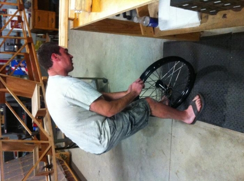 My friend and co-worker, Josiah Morgan stopped by tonight. Josiah lives right across the runway in Eagles Landing, so he stops by often. Anyhow, as he was hanging around he spotted my rims and spokes and asked, "What's with the wheels?" I explained that I was waiting for a cold winter day to pull my hair out trying to lace them. He is a bicycle guy, and has laced rims before, so the next things I know he had parts scattered on the workbench and proceeded to lace up a wheel in about an hour. Wow! I was impressed AND relieved... as much as I prefer to do my own building, lacing the wheels was not something I was looking forward to.