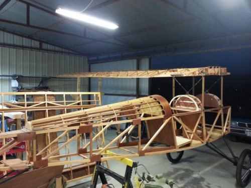 Worked late to get the left wing panel installed and supported. Trying to come up with ideas on how to level the fuselage and support/adjust the wings accurately as my hangar floor is not entirely level.