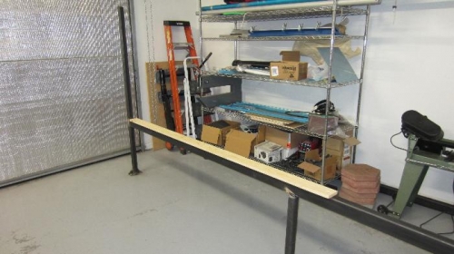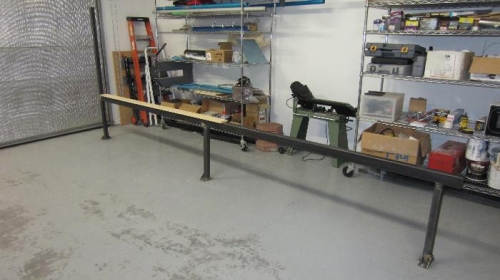 Now that the welder and plasma cutter are finally set-up, I've been able to make progress on the project for which I bought them: the empennage/wing/fuselage jig. Phase 1 is a simple metal rail with a wooden top. The horizontal stabilizer rear spar will be drilled on it and cleco'd down to the wood to keep it straight until all the holes are drilled. That's next!