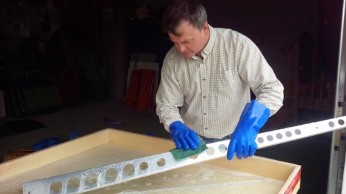 Alodining the rudder horn, trailing edge. main spar and skins. The Alumiprep seems to be doing its job - the aluminum came out nice and clean, but I am not happy with the Alodine It took far longer than it should have to obtain a reasonable "golden" color, and the last skin treated came out very patchy.