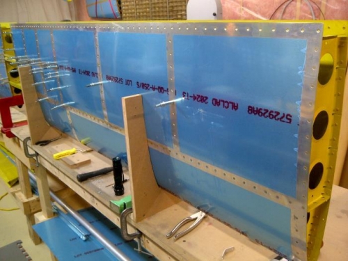 Started riveting the Left-side H-stab skin to the inspar rib assembly.