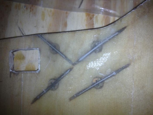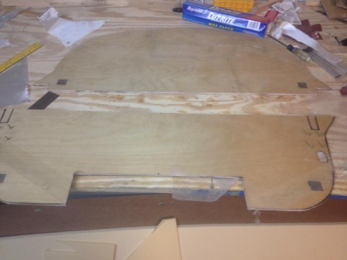 Cut out firewall from full size plans out of .25" thick plywood. Laid up 1 layer each side of BID and installed blind screws. I used a method I found on another builders sight of slotting the heads of the screws and also the firewall using welding wire to prevent the screws from spinning later. Screws were floxed in place then one layer of BID was laid over the aft face of firewall.