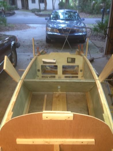 After rechecking all measurments and checking for level used nails and blocks to ensure everything could be disassembled and reassembled the exact same place. Disassemble everything and buttered flox on all joints. Reassembled parts beginning with seat back and working forward to F22. Rechecked all measuremnts and clamped everything in palce.