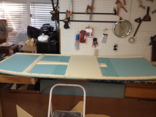 This took me several days to complete due to lack of time to work on the project. PVC foam sheets were laid on fuselage and trimmed for fit between forward landing gear bulkhead and F-22. Sheets were then glued together with 5 min epoxy. Bottom was the put back on fuselage and weighted down. Lines were drawn inside where all bulkheads met and jig was made to keep shape when transfereed to work bench. The next day I cut and shaped white foam as per the plans and instructions. The following day the foam was glued down with micro and held in place with nails for cure.