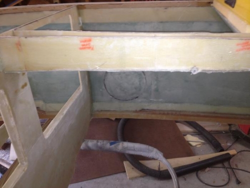 Hot glued block to instrument panel for heat duct placement. Installed seat back brace & heat duct and floxed in place. once flox cured laid up two plies BID at joints.