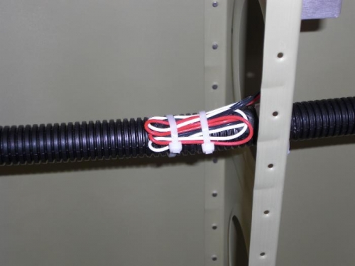 routed wiring conduit through left wing and zip tied twice at each rib. Drilled small hole in conduit and placed a grommet in the hole for the dynon heated AOA/Pitot tube controller wires.