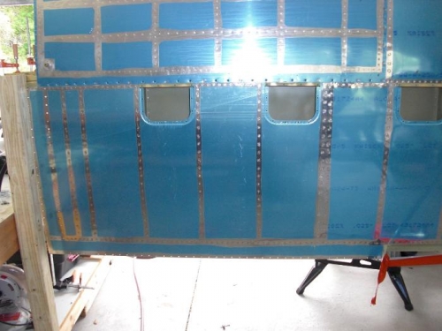 Riveted Inboard Left Wing bottom skin. No need to bend aluminum back as described in the manual. I clecoed the entire inboard skin and was able to reach every rivet through the access panel openings. It wasn't easy but was able to complete the inboard skin without any help. I purposefully left the two most inboard ribs out so as to reach the third rib from the inboard end of the wing since the flange faces inboard and cannot be reached from the inboard most access panel. see photos....