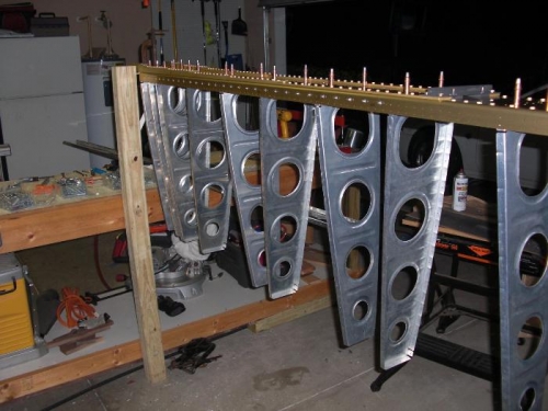 Riveted right wing ribs to main spar with the exception of the two most inboard which I will leave till after both top and bottom skins are riveted...this allows easier access to the third rib while riveting the bottom inboard skin.