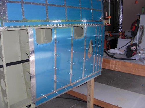 Continued riveting bottom skins of right wing. No need for two people here. Leaving the two inboard ribs off allows much easier access to ribs No. 3 and 4.