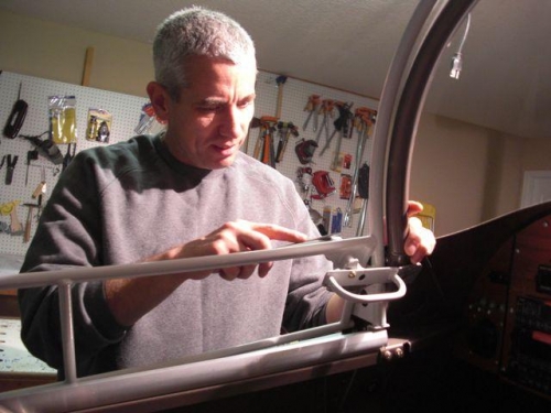 several trial fits needed after bending the frame to match the fuselage sides. Also installed the latch assembly and worked the binding parts down with a file. Drilled pilot holes for the canopy later on.