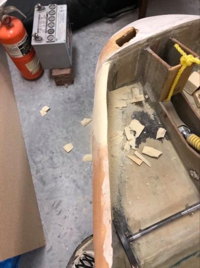 Cut out the bent and delaminated fiberglass and removed the corresponding foam from the front top left of the fuselage.