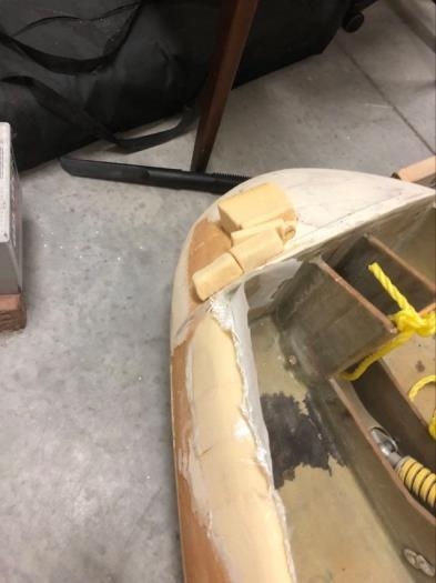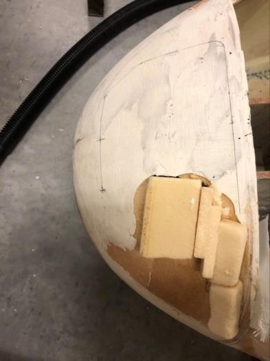 This project had a hole on the left side of the nose and no ballast compartment. I filled the hole with foam pieces held in place with 5 min epoxy. Next up I will finish shaping the foam, filling in any additional low areas and mark the location where the ballast hatch should be installed.