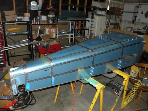 Today I continued riveting the aft fuselage. I completed the sides solo, then for the bottom, I enlisted the help of my very understanding wife to hold a large bucking bar on the outside while I backriveted from the inside. We had a few drillouts on the corners, so progress wasn't as fast as it could have been. We completed the F-778 bottom skin up to the F-707 bulkhead, the F-710 and F-708 bulkheads, and about half of the bottom of the F-707 bulkhead. We should be able to easily knock this out tomorrow.