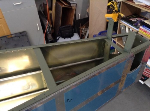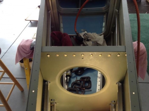 Today I riveted the newly fabricated F-710B & F-711D horizontal stabilizer attach angles to their respective bulkhead. For access I unclecoed the aft top skin and F-709 bulkhead (these were installed just for shipping, so they had to come off anyway). Access was a bit limited for some of the outboard rivets, and I had to use straight and offset sets, and no retainer spring on the gun for them. Now it's time for a little FORWARD progress!