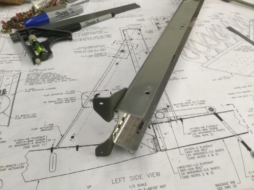 Next I fit theF-758 brackets to the bottom end of the F-766A channel, then prepped and primed the brackets (aft side only). I then drilled all of the rivet and screw holes on the nutplate attachemtn points to final size and deburred the channel. I then riveted the nutplates and brackets to the channel. Note to future self: If you ever build another RV-7, follow the directions and rivet the brackets BEFORE the nutplates...
