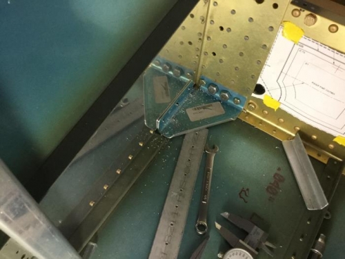 Clamped F-7114R securely in place and match drilled through side skin and lower longeron. For the drilling, I stepped through 3/32, #30, and 11/64 drill sizes followed by a 3/16 reamer.