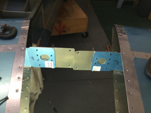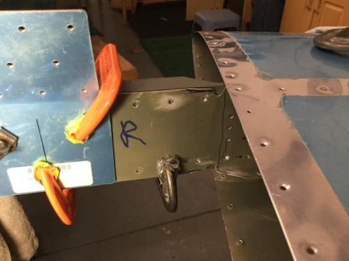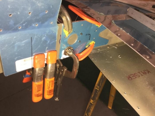 After getting the doublers clamped in place and edge distances checked and double-checked, I matched drilled and clecoed the 6 center holes and the 1 each top and bottom holes in each doubler as called for in Figure 7. (Photo 3)