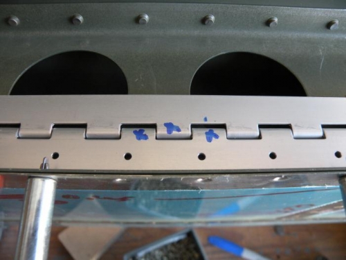 The next step was to rivet the top skin to the spar (photo 1). Before riveting the bottom of the spar, I found the center of the hinge and removed two barrels on one hinge half, and one on the other. I moved one barrel inboard from the center so I could more or less center a clip for the hinge pin ends between lightening holes in the spar (photo 2). To get the flap side of the hinge in place without totally unclecoing the bottom skin, I removed every other cleco, leaving one in every fourth hole. The hinge half is flexible enough that I could start in the center and extend one cleco at a time through the hinge. I then went back and added clecoes so every other hole was filled. I actually had to go through this process twice, as the hinge was out of place spanwise a few thousandths, and the rivets wouldn't go in the holes. I removed the hinge, then placed a few locator rivets before reclecoing it back in place. The second time was a charm. Riveting was fairly straightforward.