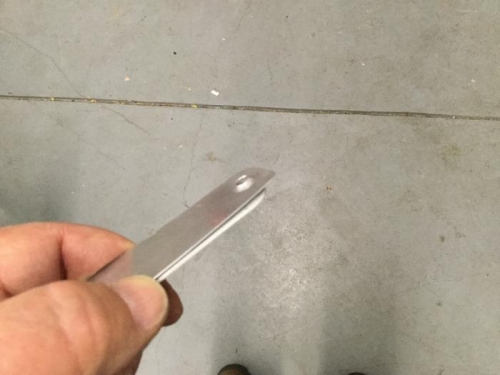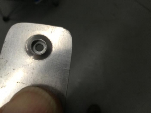 Looking through my scrap box I found a miss-drilled seat belt anchor. It's steel so the pilot hole won't wallow out as quickly. I trimmed a strip of 0.025 aluminum to more or less match the shape and drilled it to the seat belt anchor. I then drilled a #40 pilot hole through both pieces. I then enlarged and dimpled the hole in the aluminum for a #8 screw. The idea is to slip the dimpled aluminum strip between the bottom skin and the wing rib and let the dimple find the dimple in the rib, then drill through the pilot hole in the steel. It was more difficult to precisely locate than I anticipated, but seemed to work OK. I will know for sure after I dimple the bottom skin holes and reinstall the wing.