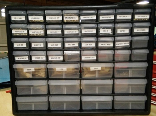 Called Van's this morning about the missing nuts. They were very quick and professional. Said they would send the missing parts right out. So I give them an A+ on service. I sorted all the hardware and stored in bins. I used a P touch labeler to make the labels. This was a bit time consuming but I hope it will keep it organized and make it easy to find the hardware when it's needed.