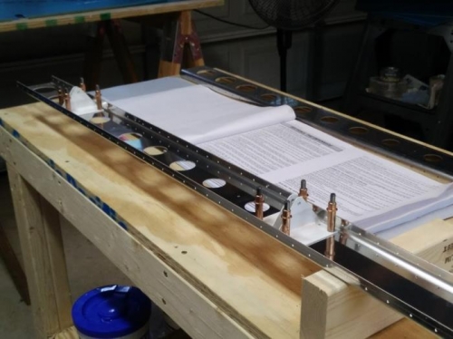 Clecoed HS 908 Rear Spar Doubler Plate to the HS 903 Rear Spars. Match drilled 1/8" holes enlarging them to #30. Clecoed the 8 HS 912 Outboard hinge brackets to the Rear Spar.