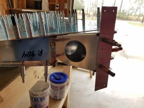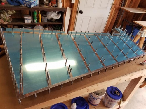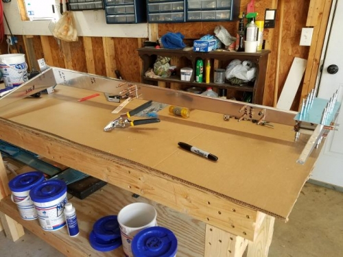 Clecoed Rudder Skeleton, Clecoed rudder skin to skeleton, Match drilled all #40 holes, Clecoed rudder horn and horn brace to rudder spar and lower rib. match drilled all holes.