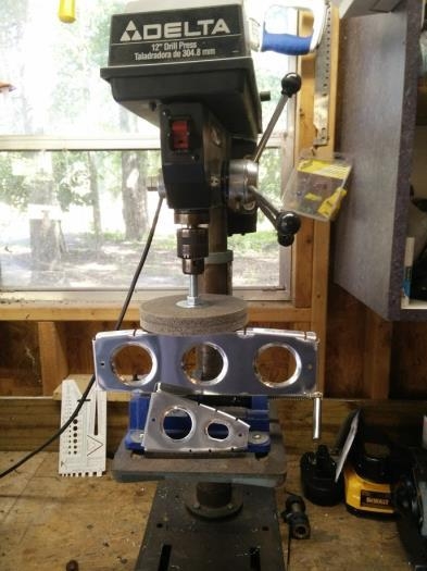 I took the 3M cut and Polish wheel off the bench grinder and mounted it on the drill press. I switched the belt to the Fastest pulley setting 3100 RPM which is just a little bit slower than the bench grinder. It is much easier to use this set up for bigger pieces.
