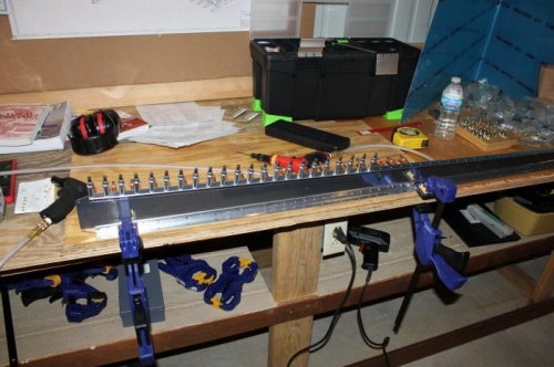 Clamped left and right spar caps into place before drilling after trimming and deburring. (Image 1)